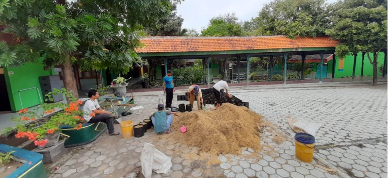 Persiapan adiwiyata dan menjelang tahun ajaran baru, guru dan karyawan bekerja sama untuk penghijauan sekolah