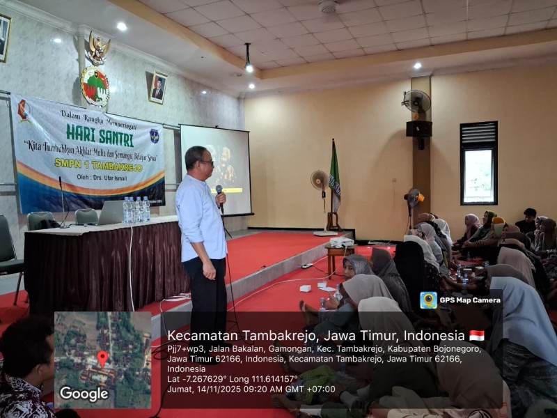 Jum’at, 14 November 2025, SMP Negeri 1 Tambakrejo menyelenggarakan kegiatan Parenting yang diadakan di ruangan KP RI Dharma Tambakrejo sebagai rangkaian lanjutan dalam peringatan Hari Santri. Kegiatan ini mengusung tema “Dengan Semangat Goal TKA Kita Tumbuhkan Akhlak Mulia dan Semangat Belajar Siswa” dan berlangsung dengan penuh khidmat. Acara dihadiri oleh para guru, orang tua/wali peserta didik, serta dua narasumber yang diundang secara resmi.